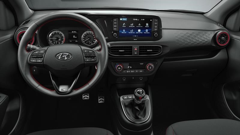 En cuanto a conectividad, el i10 hace uso de una gran pantalla táctil de 8" con cámara de retroceso y soporte para Apple CarPlay Y Android Auto, además de un conveniente cargador inalámbrico, suponiendo que tienes un teléfono con esa tecnología. Pero lo más interesante del i10 está en el sistema Bluelink de telemática, el cual opera gracias a una app. Permitirá buscar puntos de interés y enviarlos al sistema del auto, así como servicentros, estacionamientos y hasta podrás buscar tu auto con rastreo satelital. Y si el país lo permite, podrías también ubicar cámaras de velocidad, medir el tráfico y el clima, cosas que están bastante lejos de llegar a países como el nuestro.