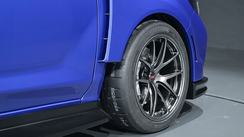 Las llantas no son tan grandes y los neumáticos, aunque de compuesto muy deportivo, no son de perfil tan bajo, fiel a la filosofia de la marca de conciliar el performance con una sensación equilibrada de grip y confort. Tras las llantas podemos ver cálipers de seis pistones en el frente y cuatro atrás, probablemente desarrolladas junto a Brembo, que ha sido el proveedor de Subaru para todos los modelos STI.